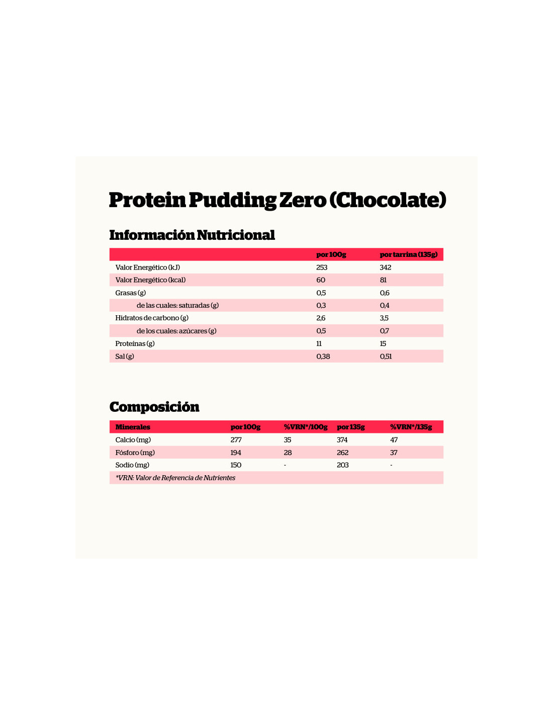 Ingredientes (Sabor Chocolate): Agua, proteínas de la leche, cacao desgrasado en polvo alcalinizado (1,7 %), almidón modificado, aromas (contienen leche), sal, emulgente (lecitina de soja), estabilizante (trifosfato pentasódico), edulcorantes (acesulfamo potásico, ciclamato sódico, sucralosa), espesantes (goma xantana, goma guar).